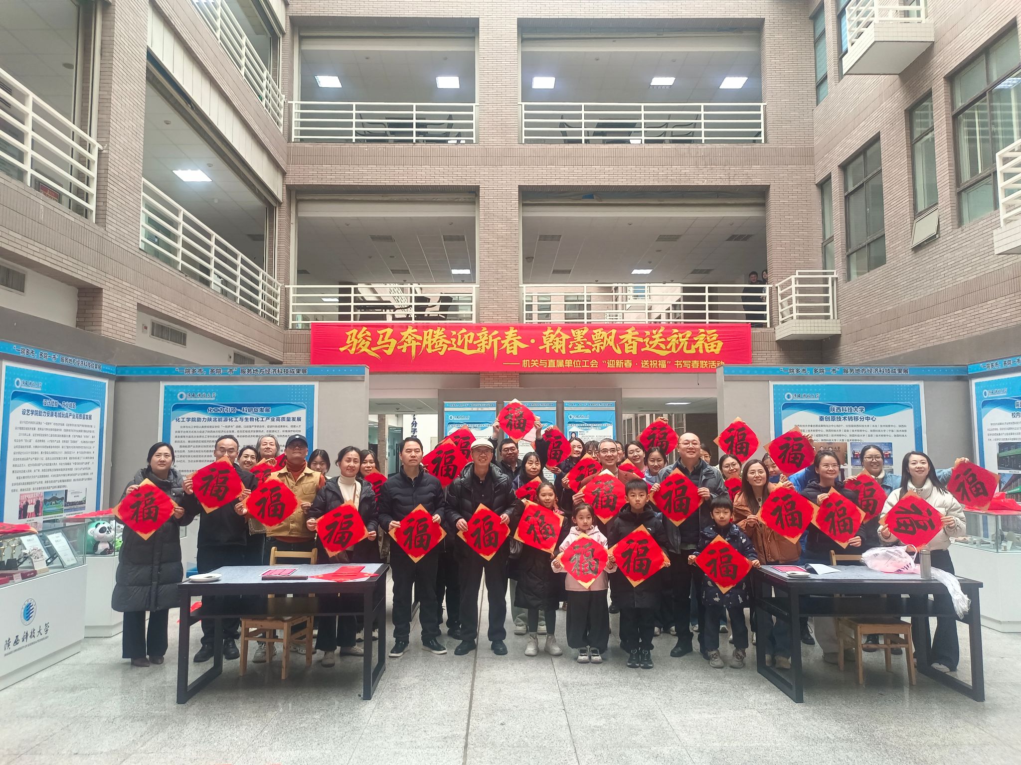 為大力弘揚中華優(yōu)秀傳統(tǒng)文化,營造歡樂祥和的校園新春氛圍,1月18日下午,機(jī)關(guān)與直屬單位工會以“駿馬奔騰迎新春·翰墨飄香送祝?!睘橹黝},在逸夫樓北大廳成功舉辦“迎新春·送祝?!贝郝?lián)書寫活動。