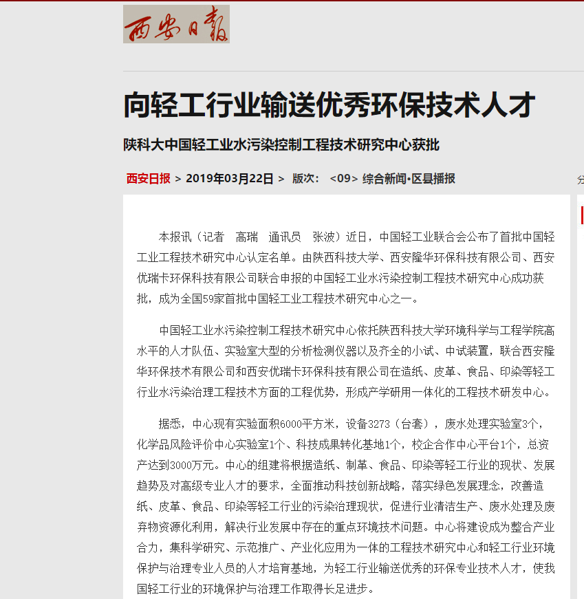 3月22日,《西安日?qǐng)?bào)》刊發(fā)文章,報(bào)道了由陜西科技大學(xué)、西安隆華環(huán)??萍加邢薰?、西安優(yōu)瑞卡環(huán)保科技有限公司聯(lián)合申報(bào)的中國(guó)輕工業(yè)水污染控制工程技術(shù)研究中心成功獲批。全文轉(zhuǎn)載如下: