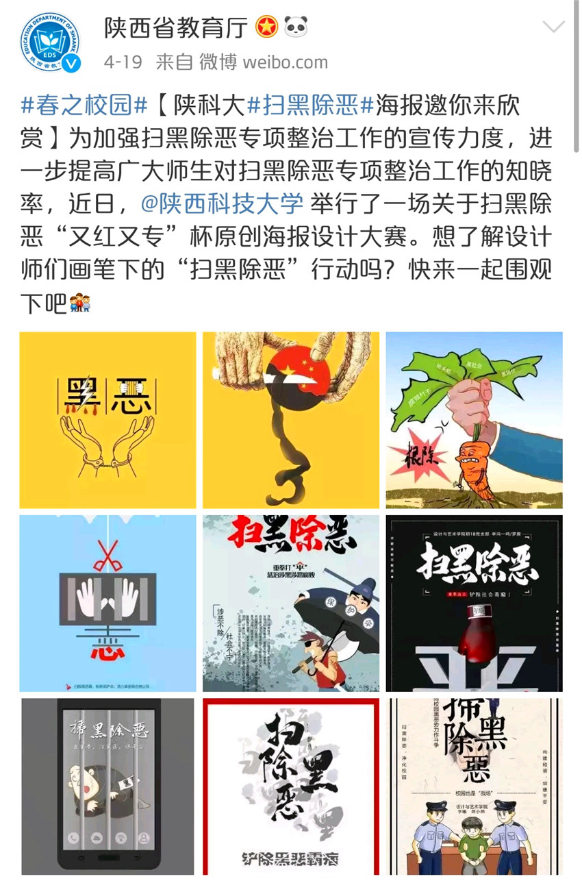 此次活動(dòng)還受到了陜西省教育廳官方微博的轉(zhuǎn)發(fā),加強(qiáng)了設(shè)計(jì)與藝術(shù)學(xué)院掃黑除惡專項(xiàng)斗爭(zhēng)工作的宣傳力度,進(jìn)一步提高了廣大師生對(duì)掃黑除惡專項(xiàng)斗爭(zhēng)工作的知曉率。