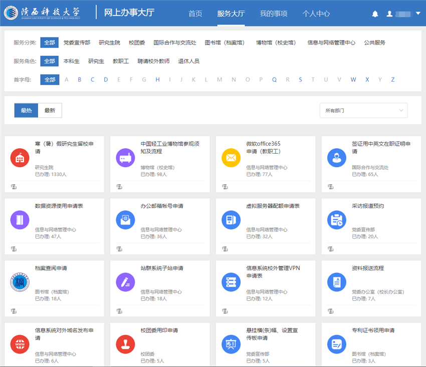 經(jīng)過與多個職能部門的反復(fù)溝通、制作、測試,目前,“網(wǎng)上辦事大廳”已建事項50余項,第一批發(fā)布事項22項,涉及黨委宣傳部、校團(tuán)委、研究生院、國際處、檔案館、中國輕工業(yè)博物館等部門,包括采訪報道預(yù)約、橫幅懸掛申請、研究生寒暑假留校申請、博物館參觀預(yù)約、簽證用中英文在職證明、校團(tuán)委用印、檔案查閱、專利證書領(lǐng)用、站群子站申請、學(xué)生郵箱激活等多項事項的申請和審批流程。