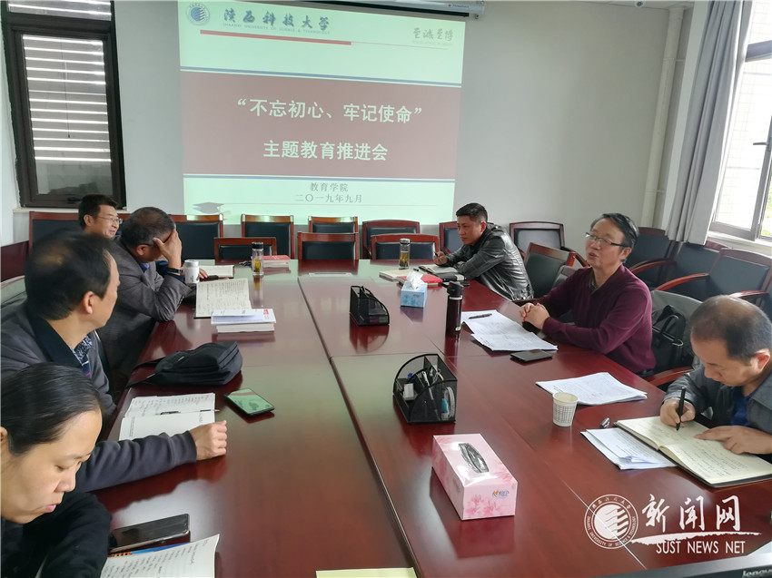 王貴平首先對(duì)我?!安煌跣?、牢記使命”主題教育黨委理論學(xué)習(xí)中心組(擴(kuò)大)會(huì)議的精神進(jìn)行了傳達(dá),認(rèn)真學(xué)習(xí)了校黨委書(shū)記姚書(shū)志的講話;院長(zhǎng)助理蔡國(guó)敏詳細(xì)地傳達(dá)了中共陜西科技大學(xué)委員會(huì)開(kāi)展“不忘初心、牢記使命”主題教育工作方案。王貴平結(jié)合學(xué)院的實(shí)際,從總體要求、目標(biāo)任務(wù)、具體安排、組織領(lǐng)導(dǎo)等四個(gè)方面對(duì)學(xué)院的主題教育進(jìn)行了安排和布置。