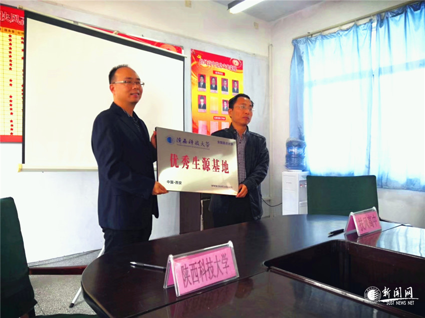 化學(xué)與化工學(xué)院黨委副書記趙鋼向扶風(fēng)高中校長(zhǎng)張建軍授“陜西科技大學(xué)優(yōu)秀生源基地”牌匾