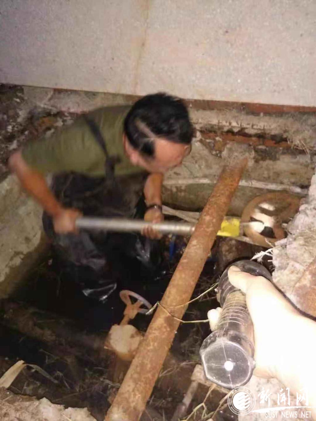 動力中心水電維修班葛磊師傅,冒著寒冷,不顧全身濕透,正在精心維修南區(qū)域供暖管道漏水點