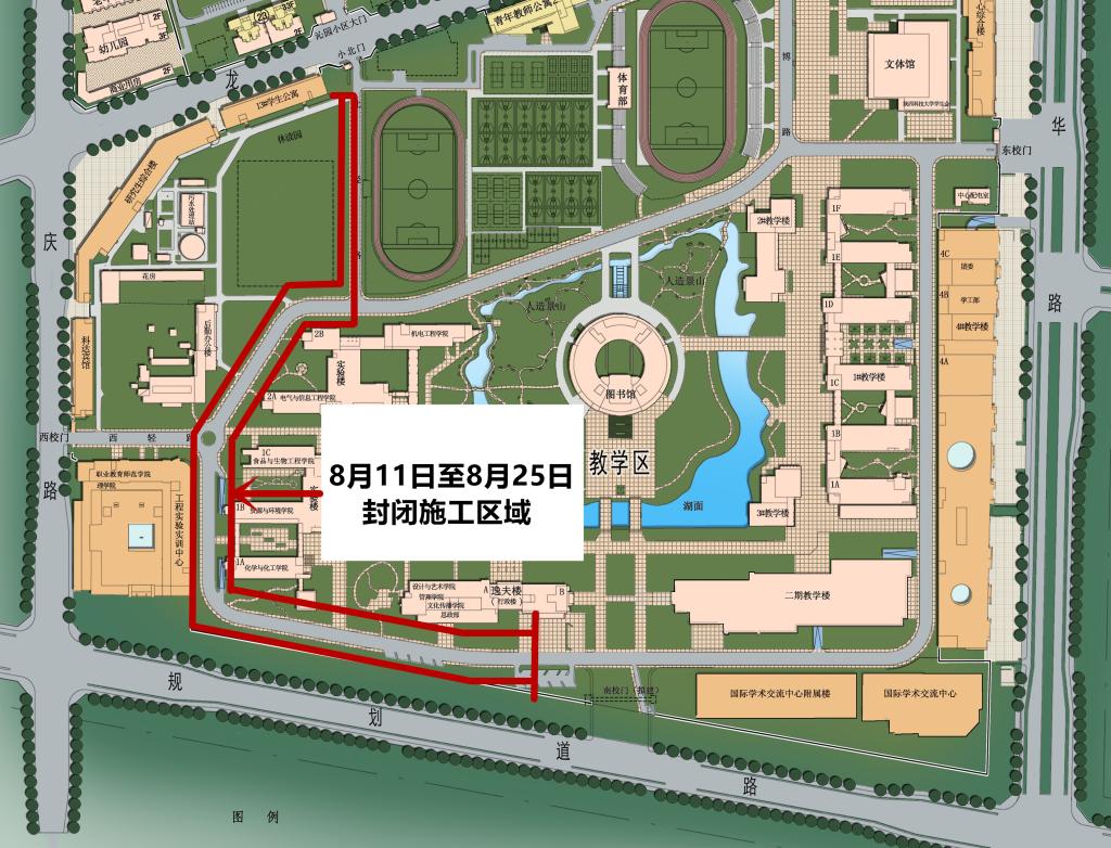 我校教學(xué)區(qū)環(huán)道維修改造工程正在緊張有序進(jìn)行,為保證施工質(zhì)量、安全,確保工程按期完工,同時(shí)盡可能減小對(duì)教學(xué)區(qū)內(nèi)車輛通行的影響,故根據(jù)工程進(jìn)度,現(xiàn)將8月11日至8月25日封閉施工的區(qū)域公布如下:
