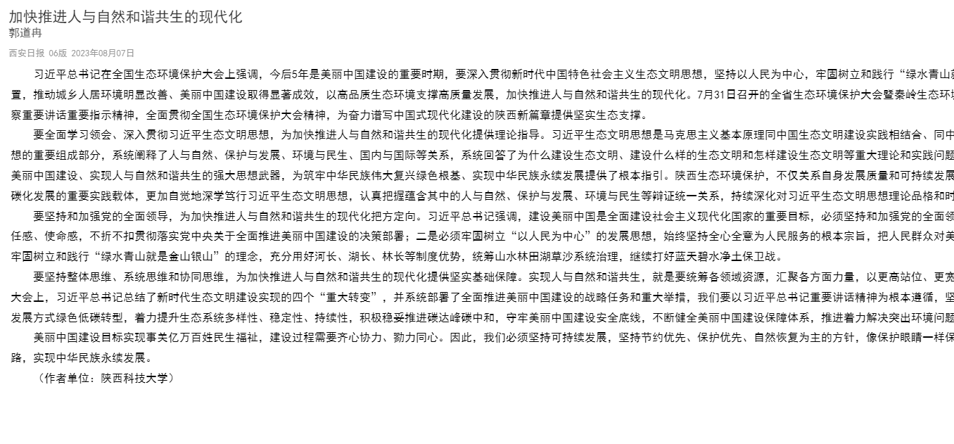 習(xí)近平總書記在全國(guó)生態(tài)環(huán)境保護(hù)大會(huì)上強(qiáng)調(diào),今后5年是美麗中國(guó)建設(shè)的重要時(shí)期,要深入貫徹新時(shí)代中國(guó)特色社會(huì)主義生態(tài)文明思想,堅(jiān)持以人民為中心,牢固樹立和踐行“綠水青山就是金山銀山”的理念,把建設(shè)美麗中國(guó)擺在強(qiáng)國(guó)建設(shè)、民族復(fù)興的突出位置,推動(dòng)城鄉(xiāng)人居環(huán)境明顯改善、美麗中國(guó)建設(shè)取得顯著成效,以高品質(zhì)生態(tài)環(huán)境支撐高質(zhì)量發(fā)展,加快推進(jìn)人與自然和諧共生的現(xiàn)代化。7月31日召開的全省生態(tài)環(huán)境保護(hù)大會(huì)暨秦嶺生態(tài)環(huán)境保護(hù)會(huì)議強(qiáng)調(diào),要深入學(xué)習(xí)貫徹習(xí)近平生態(tài)文明思想和習(xí)近平總書記來(lái)陜考察重要講話重要指示精神,全面貫徹全國(guó)生態(tài)環(huán)境保護(hù)大會(huì)精神,為奮力譜寫中國(guó)式現(xiàn)代化建設(shè)的陜西新篇章提供堅(jiān)實(shí)生態(tài)支撐。