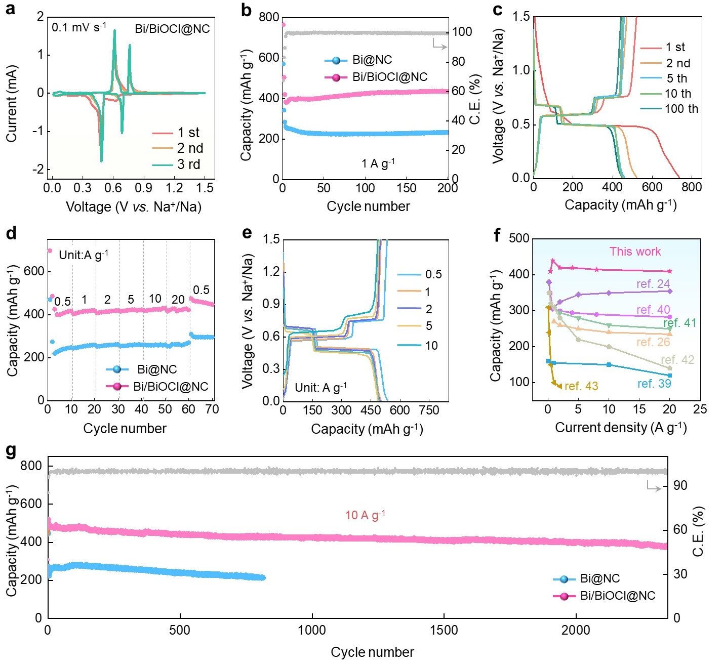 由于原料儲(chǔ)量豐富且成本低廉,鈉離子電池受到了前所未有的關(guān)注。然而,由于缺乏具有快速充電能力和極高穩(wěn)定性的替代負(fù)極材料,鈉離子電池的廣泛應(yīng)用受到了阻礙。為了應(yīng)對(duì)這一挑戰(zhàn),本論文開發(fā)了一種能夠快速充電的鈉離子電池負(fù)極材料,即嵌入氮摻雜碳框架的Bi/BiOCl(Bi/BiOCl@NC),該負(fù)極材料具有快速的Na+傳輸通道和超高的結(jié)構(gòu)穩(wěn)定性。在乙醚電解質(zhì)中循環(huán)時(shí),Bi/BiOCl@NC會(huì)發(fā)生顯著的結(jié)構(gòu)轉(zhuǎn)變,形成三維多孔骨架結(jié)構(gòu),這有利于增加Na+傳輸通道和縮減Na+傳輸距離,并能適應(yīng)充放電過程中的體積變化。通過密度泛函理論計(jì)算模擬Na+在該結(jié)構(gòu)中的儲(chǔ)存行為,發(fā)現(xiàn)Bi/BiOCl@NC具有較低的Na+傳輸勢(shì)壘(0.056 eV)和出色的電子導(dǎo)電性。獨(dú)特的結(jié)構(gòu)使得Bi/BiOCl@NC負(fù)極材料在20 A g–1條件下具有410 mAh g–1的超高Na+儲(chǔ)存能力,并能在10 A g–1的高電流密度條件下穩(wěn)定循環(huán)超過2300次,這一結(jié)果刷新了已報(bào)道的鈉離子電池負(fù)極材料的性能表現(xiàn)。這項(xiàng)工作為鈉離子電池提供了一種極具前景的負(fù)極材料,并將激勵(lì)研究人員開發(fā)出更多的新型儲(chǔ)能系統(tǒng)。