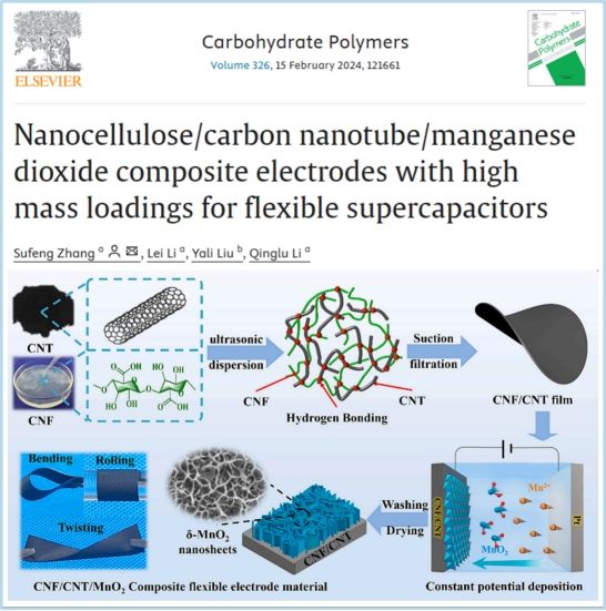 同時,研究了一種通過電化學沉積高質(zhì)量二氧化錳(MnO2)到納米纖維素(CNF)和碳納米管(CNT)導電膜表面的方法來構(gòu)建具有高電容和機械性能的柔性復(fù)合電極材料。相關(guān)研究成果以“Nanocellulose/carbon nanotube/manganese dioxide composite electrodes with high mass loadings for flexible supercapacitors”為題發(fā)表國際期刊Carbohydrate Polymers(文章鏈接:https://doi.org/10.1016/j.carbpol.2023.121661)。