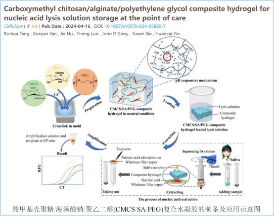 本課題組唐蕊華副教授在紙基傳感器檢測研究方面取得一定進展,相關(guān)成果以“Carboxymethyl chitosan/alginate/polyethylene glycol composite hydrogel for nucleic acid lysis solution storage at the point of care”為題發(fā)表在Cellulose期刊(文章鏈接:https://doi.org/10.1007/s10570-024-05889-7)。本研究通過物理交聯(lián)的方法研發(fā)了一種pH響應(yīng)的羧甲基殼聚糖/海藻酸鈉/聚乙二醇(CMCS/SA/PEG)復(fù)合水凝膠,采用干浸漬法儲存樣品裂解液。結(jié)果表明:CMCS/水楊酸/聚乙二醇6000復(fù)合水凝膠具有較大的孔徑(256.58±5.58微米)、良好的濕強度(282.3 Kpa)、優(yōu)異的溶脹率(706.91±6.69%)、較高的吸水倍率 負載量(90.46±1.13%),降解良好容量(77.87±1.45%)和快速響應(yīng)時間 (15 s)。此水凝膠可以與濾紙一起集成于注射器中組裝成一種核酸快速提取裝置。