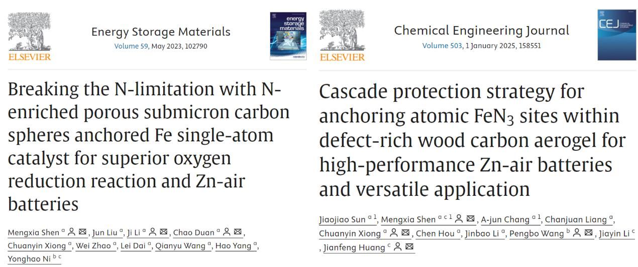 沈夢霞副教授課題組以木質(zhì)纖維等生物質(zhì)通過金屬交聯(lián)、活性物質(zhì)和熱犧牲金屬模板引入等策略,制備了一系列基于納米纖維素的氣凝膠體系,并通過對碳氣凝膠微結(jié)構(gòu)中金屬活性位點優(yōu)化篩選、孔結(jié)構(gòu)和碳質(zhì)缺陷等精細調(diào)控,構(gòu)建了系列碳載金屬單原子催化劑,實現(xiàn)了高性能鋅空氣電池應(yīng)用。相關(guān)研究成果發(fā)表在Energy Storage Materials, Chemical Engineering Journal, Journal of Colloid and Interface Science等期刊。此外,利用改性木材氣凝膠的定向多孔結(jié)構(gòu)負載具有高介電常數(shù)的MXene和磁性稀土氧化物Gd2O3,并結(jié)合MoS2納米片以形成多重異質(zhì)界面,制備了具有磁-介電協(xié)同和多層結(jié)構(gòu)的MoS2@Gd2O3/Mxene多孔碳氣凝膠復(fù)合材料,實現(xiàn)阻抗匹配和多重電磁波損耗機制,該木材衍生材料展現(xiàn)出優(yōu)異的電磁波吸收性能(Small 2024, 2306915)。其中有5篇論文入選ESI高被引論文,部分文章鏈接:https://doi.org/10.1016/j.ensm.2023.102790,https://doi.org/10.1002/smll.202306915,https://doi.org/10.1016/j.cej.2024.158551。