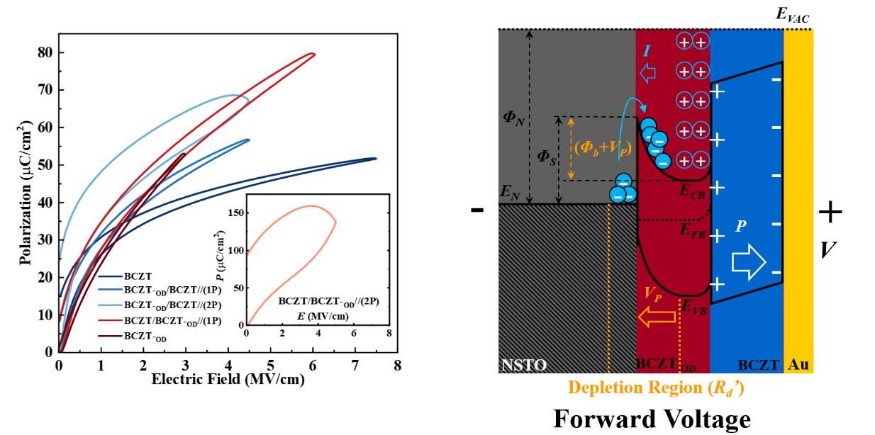 圖2 不同結(jié)構(gòu)薄膜在正向三角波下的電滯回線與BCZT/BCZT-OD//(1P)薄膜/電極界面附近在正偏壓下的能帶結(jié)構(gòu)