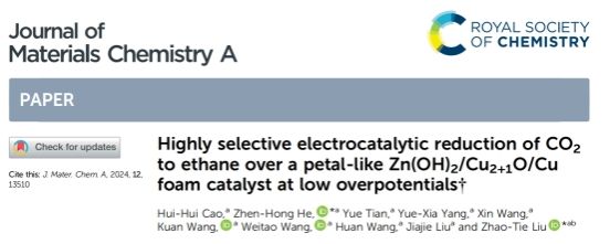 此外,開發(fā)了一種構(gòu)建Cu2+1O電催化劑的策略,通過Zn(OH)2穩(wěn)定Cu2+1O,在泡沫銅上形成片狀結(jié)構(gòu)的Zn(OH)2/Cu2+1O催化劑,實現(xiàn)電催化CO2還原為C2H6在低過電位下(-0.3?-0.6V (vs. RHE))產(chǎn)生較高的法拉第效率(在-0.3V下,產(chǎn)生C2H6的法拉第效率高達(dá)67.8%),且該催化劑可以連續(xù)應(yīng)用至少三天,具有可接受的電催化性能。相關(guān)研究工作以“Highly selective catalytic reduction of CO2 to ethane over a petal-like Zn(OH)2/Cu2+1O/Cu foam catalyst at low overpotentials”為題發(fā)表在Journal of Materials Chemistry A(IF=10.8)期刊上,該研究對電催化CO2還原產(chǎn)生C2H6提供了一種新的策略。我校博士研究生郭攀攀、曹會會為第一作者,何珍紅教授和劉昭鐵教授為共同通訊作者,陜西科技大學(xué)為第一通訊單位,陜西師范大學(xué)為共同通訊單位。