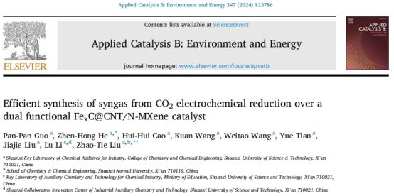 圍繞CO2資源利用,采用熱解法制備了FexC@CNT/N-MXene催化劑,用于催化二氧化碳和水共電解生成CO和H2。通過調(diào)節(jié)外加電位,產(chǎn)生具有不同H2/CO摩爾比的合成氣,其中在-1.1 V (vs. RHE)獲得等量的CO和H2,可直接用于氫甲?;虵T合成等反應(yīng)。表征結(jié)果表明,在制備過程中形成了FexC、碳納米管和摻雜N的MXene。本研究為CO2ER和HER共電解合成氣提供了一種高效的催化劑,該策略對設(shè)計其他偶聯(lián)反應(yīng)的雙功能催化劑提供思路。相關(guān)研究工作以“Efficient synthesis of syngas from CO2 electrochemical reduction over a dual functional FexC@CNT/N-MXene catalyst”為題,發(fā)表在Applied Catalysis B: Environment and Energy(IF=20.3)。