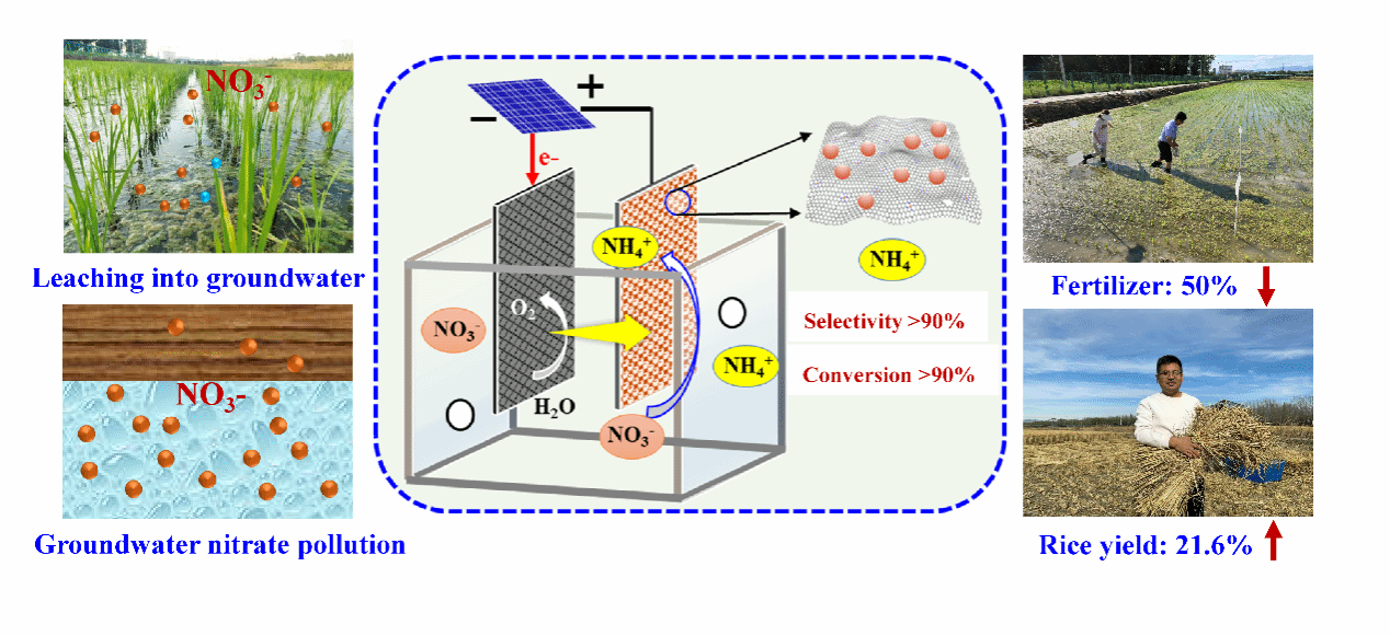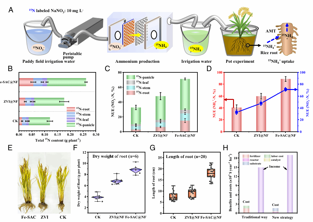 基于水稻喜銨特性以及稻田灌溉水富含硝酸鹽的特點(diǎn),課題組提出將稻田灌溉水中硝酸鹽轉(zhuǎn)化為銨以促進(jìn)水稻氮吸收并替代部分化肥的策略。通過(guò)盆栽實(shí)驗(yàn)驗(yàn)證,該策略使水稻產(chǎn)量提高超20%,化肥使用量減少50%。課題組在前期研究基礎(chǔ)上,巧妙將單原子鐵催化劑嵌入電化學(xué)技術(shù),實(shí)現(xiàn)了實(shí)際稻田灌溉水中硝酸鹽高選擇性(大于 90%)快速還原為銨。15N同位素示蹤技術(shù)進(jìn)一步證實(shí),超過(guò)80%的環(huán)境硝酸鹽氮素被水稻吸收利用。