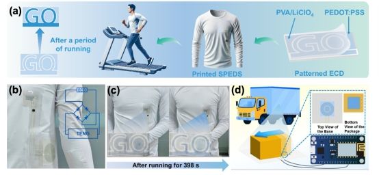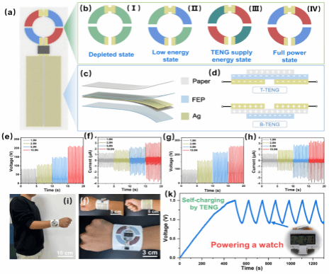 【工作2】:通過導電性、電容性和電致變色性能的協同增強,印刷制備了具有寬色域、雙電極顏色組合及增強性能的紙面光調制顯示系統(tǒng)。同時,利用紙張的摩擦起電特性,構建了由雙面發(fā)電摩擦納米發(fā)電機驅動的多信息顯示、儲能增強和高能量回收利用率的自充電能量顯示系統(tǒng)(SPEDS),并將此系統(tǒng)作為運動紙腕帶,在運動摩擦中,顯示相關信息。