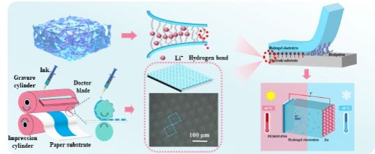 【工作3】:通過紙面的本征粗糙度和凹版印刷的微觀結構,有效提升了紙面功能層的電化學性能。同時,基于霍夫邁斯特效應以及紙張表面電極界面與電解質的耦合增強作用,開發(fā)了一種新型耐低溫(-40 ℃)、全固態(tài)紙基自供能電致變色器件。