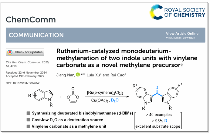 碳酸亞乙烯酯(VC)作為C2、C3合成子已得到廣泛而深入的研究,但作為C1合成子偶聯(lián)片段的開發(fā)與應(yīng)用卻相對匱乏。南江團隊近期成功開發(fā)了一種釕催化吲哚類化合物與碳酸乙烯酯(VC)的單氘甲基化偶聯(lián)反應(yīng),并以此構(gòu)建結(jié)構(gòu)多樣的氘化雙吲哚甲烷衍生物(d-BIMs)。該方法的顯著優(yōu)勢體現(xiàn)在:1)創(chuàng)新性采用廉價易得的VC作為新型氘代亞甲基前體;2)成功實現(xiàn)藥物分子的后期氘代修飾與功能化。該策略為開發(fā)氘標記生物活性分子提供了新思路與新途徑。相關(guān)成果以“Ruthenium-catalyzed monodeuterium-methylenation of two indole units with vinylene carbonate as anovel methylene precursor”為題發(fā)表在自然指數(shù)期刊Chemical Communications上,實驗工作主要由2022級碩士生徐露露完成。