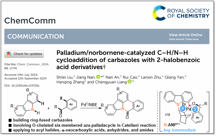 傳統(tǒng)的Catellani反應(yīng)從最初的芳基碘化物通過金屬鈀(0)與NBE的五元鈀雜環(huán)協(xié)同催化,將C-H活化、偶聯(lián)反應(yīng)與降冰片烯的遷移插入巧妙結(jié)合,在單一步驟中完成芳環(huán)上官能團的引入。南江團隊發(fā)展了一種鈀/降冰片烯(NBE)以六元鈀雜環(huán)參與轉(zhuǎn)化的協(xié)同催化體系,成功實現(xiàn)了2-溴苯甲酸與咔唑類化合物的C-H/N-H環(huán)加成反應(yīng)。該工作不僅拓展了Catellani反應(yīng)底物的多樣性,更從機理層面豐富了過渡金屬催化劑鈀物種的多樣性。該工作以“Palladium/norbornene-catalyzed C–H/N–Hcycloaddition of carbazoles with 2-halobenzoic acid derivatives”為題為題發(fā)表在自然指數(shù)期刊Chemical Communications上,實驗工作主要由2023級博士生劉石磊完成。