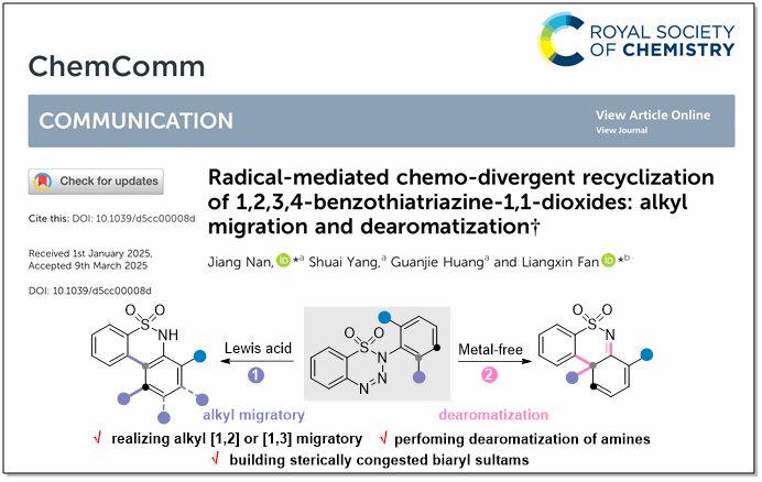 受熵不利的過渡態(tài)和σ-π超共軛效應(yīng)的影響,芳基C(sp2)-烷基重排的策略相對有限。南江團隊通過創(chuàng)新自由基介導(dǎo)策略,成功實現(xiàn)苯并噻嗪氧化物脫氮氣環(huán)化轉(zhuǎn)化新方法。該工作突破傳統(tǒng)芳基重排反應(yīng)限制,開發(fā)出新型芳基C(sp2)-烷基遷移路徑,高效合成傳統(tǒng)方法難以制備的大位阻二苯并磺酰胺類化合物;同步通過條件調(diào)控實現(xiàn)苯并噻嗪氧化物去芳構(gòu)化轉(zhuǎn)化,精準構(gòu)筑含全取代季碳中心的新型分子骨架。相關(guān)成果以“Radical-mediated chemo-divergent recyclization of 1,2,3,4-benzothiatriazine-1,1-dioxides: alkyl migration and dearomatization”為題發(fā)表在自然指數(shù)期刊Chemical Communications上,實驗工作主要由2022級碩士生楊帥完成。