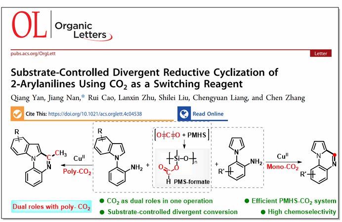 利用CO2作為“碳源”在有機合成轉(zhuǎn)化領(lǐng)域備受關(guān)注,尤其是在雙分子CO2轉(zhuǎn)化方面存在諸多挑戰(zhàn)。南江團隊利用Cu-PMHS的還原體系,通過精準調(diào)控底物結(jié)構(gòu)首次實現(xiàn)了CO2在單一反應(yīng)中的雙重角色。對于2-吲哚苯胺,CO2通過雙分子還原參與反應(yīng),高效構(gòu)建了含甲基的喹喔啉衍生物;而2-吡咯苯胺則選擇性地捕獲單分子CO2,生成結(jié)構(gòu)多樣的喹喔啉類化合物。該策略創(chuàng)新性揭示了底物結(jié)構(gòu)與雙甲?;虚g體形成對反應(yīng)選擇性的關(guān)鍵調(diào)控作用,為CO2的多樣性轉(zhuǎn)化提供了新思路。該工作以“Substrate-Controlled Divergent Reductive Cyclization of 2Arylanilines Using CO2 as a Switching Reagent”為題發(fā)表在有機化學(xué)領(lǐng)域國際知名期刊Organic Letters上,實驗工作主要由2022級博士生閆強完成。