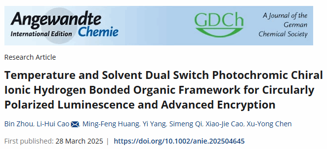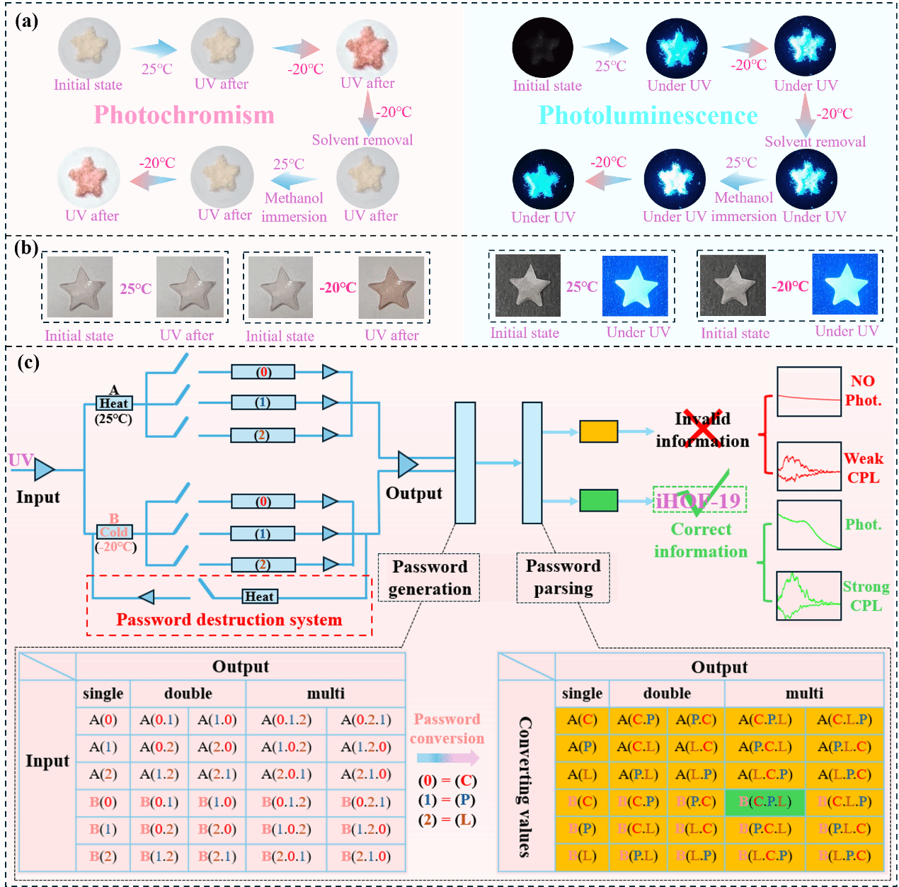 (3). (3).R/S-iHOF-19首次將離子型氫鍵有機(jī)框架材料應(yīng)用于光致變色和CPL材料交叉領(lǐng)域。將光致變色特性與圓偏振發(fā)光特性集成于同一材料體系中,實(shí)現(xiàn)光響應(yīng)與手性發(fā)光的協(xié)同作用。實(shí)現(xiàn)了在同一個分子結(jié)構(gòu)中將溫度、溶劑雙重控制的智能響應(yīng)光致變色和圓偏振發(fā)光性實(shí)現(xiàn)完美的集成融合,并對其構(gòu)效關(guān)系和相互作用機(jī)理進(jìn)行深入的研究和討論。并且,結(jié)合多學(xué)科特性,將光致變色和CPL技術(shù)與信息加密需求匹配,推動功能晶態(tài)材料在信息加密領(lǐng)域的創(chuàng)新應(yīng)用。