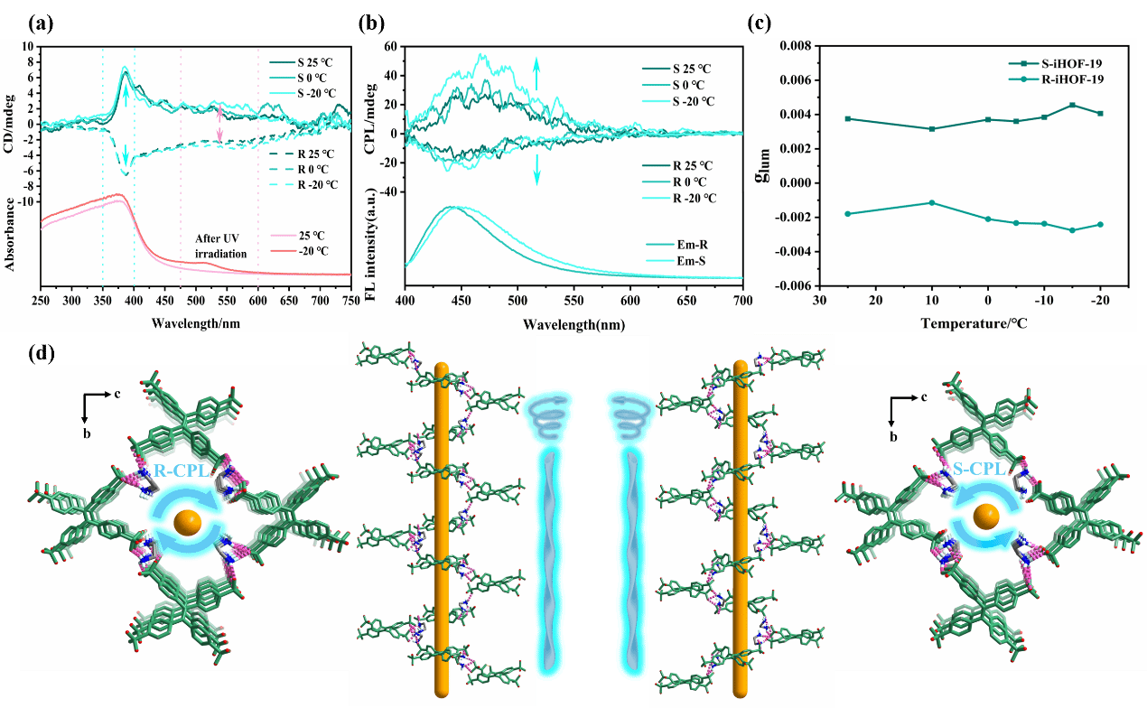 (2). (2).R/S-DPEN的手性基團(tuán)通過與H4TPE自組裝后手性尺度得到放大可以獲得更高的glum值。手性胺陽離子的作用使得R/S-iHOF-19具有良好的圓偏振發(fā)光性質(zhì),并且在溫度降低的過程中R/S-iHOF-19的圓偏振發(fā)光性能不段增強(qiáng)。通過氫鍵和離子鍵作用實(shí)現(xiàn)了手性信號的傳遞和放大。