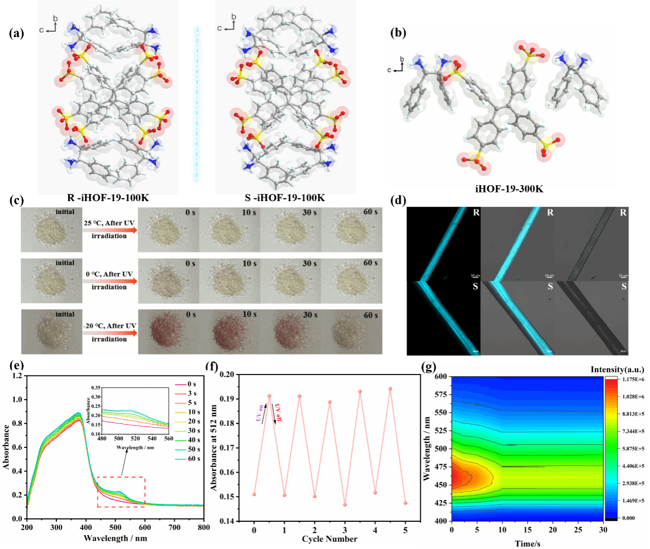 (1). R/S-iHOF-19充分發(fā)揮其結(jié)構(gòu)靈活性和氫鍵的動態(tài)特性,實(shí)現(xiàn)材料性能的精準(zhǔn)調(diào)控。通過調(diào)控結(jié)構(gòu)框架中的溶劑(水和甲醇)分子的得失可以控制光致變色的開關(guān)。實(shí)現(xiàn)了具有溫度、溶劑雙重控制的智能響應(yīng)光致變色材料的探索和合成。