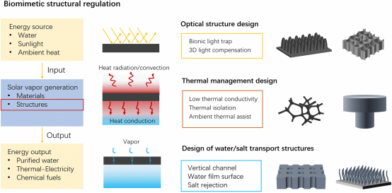 近年來,太陽能界面蒸發(fā)技術(shù)以其低碳排放和高效蒸發(fā)的顯著優(yōu)勢,成為應(yīng)對全球淡水資源短缺的重要解決方案。自然界中生物結(jié)構(gòu)的高效能量利用機制為這一技術(shù)的發(fā)展提供了寶貴的啟發(fā)。有鑒于此,該論文系統(tǒng)總結(jié)了仿生設(shè)計在太陽能界面蒸發(fā)器(SIE)中的應(yīng)用,深入分析了仿生結(jié)構(gòu)在增強光吸收、熱管理和水/鹽傳輸性能方面的最新進(jìn)展。此外,該論文還總結(jié)了當(dāng)前仿生設(shè)計在實際應(yīng)用和規(guī)?;圃熘忻媾R的挑戰(zhàn)及未來發(fā)展方向。該論文系統(tǒng)梳理了SIE領(lǐng)域中仿生設(shè)計與制造的關(guān)鍵研究成果,為SIE的性能優(yōu)化構(gòu)建了多維設(shè)計矩陣,有望為開發(fā)高效、可持續(xù)的太陽能界面蒸發(fā)技術(shù)提供了科學(xué)依據(jù)與創(chuàng)新思路。