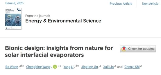 近日,我校材料科學(xué)與工程學(xué)院(文物保護(hù)科學(xué)與技術(shù)學(xué)院)光熱材料的功能化調(diào)控與應(yīng)用創(chuàng)新團隊在材料學(xué)國際頂級期刊《Energy & Environmental Science》(影響因子:32.4)上發(fā)表了題為“Bionic design: insights from nature for solar interfacial evaporators”的綜述性論文,并被選為當(dāng)期Inside Front Cover(內(nèi)封面)。我校王成兵教授、浙江大學(xué)李洋研究員為論文共同通訊作者,碩士研究生王博為論文第一作者,陜西科技大學(xué)為第一通訊單位。該論文的發(fā)表顯著提升了我校在光熱界面蒸發(fā)領(lǐng)域的國際影響力。