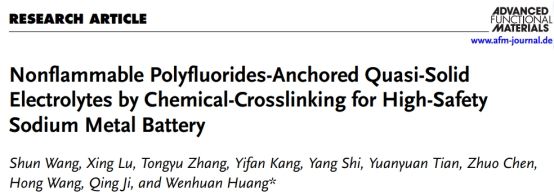基于上述問題,近日,陜西科技大學(xué)化學(xué)與化工學(xué)院黃文歡教授團(tuán)隊設(shè)計并制備了氟修飾固態(tài)薄膜,以同時調(diào)控鈉離子傳輸和固體電解質(zhì)界面(SEI)的形成。研究表明基于該固態(tài)薄膜的鈉金屬扣式/袋式電池均表現(xiàn)出高循環(huán)穩(wěn)定性(在0.5/1 C下, 4000/2000循環(huán)后,容量分別為86.9和80.0 mAh g-1)。此外,該薄膜能夠在高溫條件下分解產(chǎn)生氟清除自由基,能夠有效阻斷電池?zé)崾Э貢r的燃燒鏈?zhǔn)椒磻?yīng),從而防止電池二次燃燒。研究成果發(fā)表于學(xué)術(shù)期刊Advanced Functional Materials,題為“Nonflammable Polyfluorides-Anchored Quasi-Solid Electrolytes by chemical-crosslinking for High-Safety Sodium Metal Battery”。