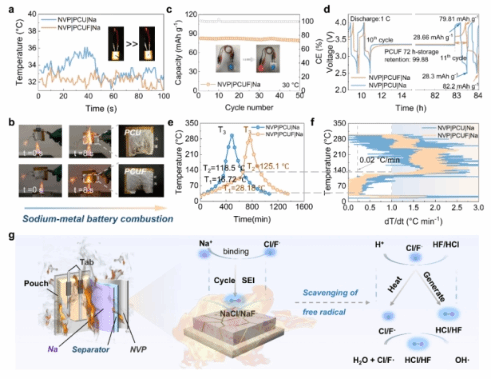 圖5:基于PCUF電解質(zhì)準(zhǔn)固態(tài)鈉金屬軟包電池高溫性能,ARC測試及電池阻燃機理