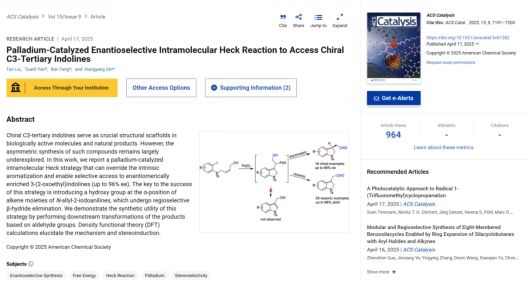 Liu Tao, Yao Tuanli*, Fang Ran*, Qin Xiangyang*, Palladium-Catalyzed Enantioselective Intramolecular Heck Reaction to Access Chiral C3-Tertiary Indolines. ACS Catalysis, 2025, 15, 7191-7200.
