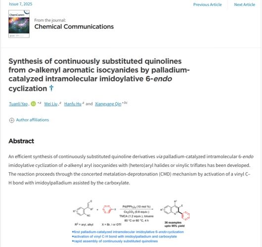 Yao Tuanli*, Liu Wei, Hu Hanfu, Qin Xiangyang*. Synthesis of Continuously Substituted Quinolines from o-Alkenyl Aromatic Isocyanides by Palladium-Catalyzed Intramolecular Imidoylative 6-endo Cyclization?. Chemical Communications, 2025, 61, 1399-1402.