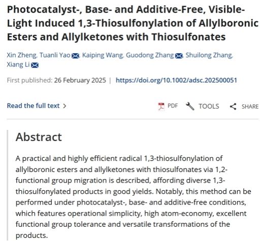 自由基介導的官能團遷移反應是近年來的研究熱門,由于官能團遷移過程中大多數(shù)經(jīng)歷了環(huán)狀過渡態(tài),因此相對比較穩(wěn)定的五/六元環(huán)過渡態(tài)形成的1,4-, 1,5-遷移過程得到了比較長足的發(fā)展。而經(jīng)歷三元環(huán)過渡態(tài)的1,2-遷移反應仍報道較少,在此背景下,本文發(fā)展了一種利用可見光誘導硫代磺酸酯為雙官能化試劑,在無光催化劑、無堿及無添加劑體系下,實現(xiàn)烯丙酮和烯丙基硼酸酯的1,3-硫代磺?;磻T摮晒浴癙hotocatalyst-, Base- and Additive-Free, Visible-Light Induced 1,3-Thiosulfonylation of Allylboronic Esters and Allylketones with Thiosulfonates”為題,發(fā)表在國際著名期刊Advanced Synthesis & Catalysis上。博士研究生鄭鑫為第一作者,姚團利教授、李翔副教授和揚州大學張國棟博士為通訊作者,陜西科技大學為第一通訊單位。