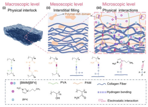 我校輕工科學(xué)與工程學(xué)院(柔性電子學(xué)院)陳詠梅教授團隊在皮革膠原纖維間的豐富間隙中原位聚合形成聚乙烯醇(PVA)-聚丙烯酰胺(PAM)水凝膠,然后在離子液體([BMIM][BF4])中進行浸泡處理,通過多尺度界面設(shè)計,即宏觀上,離子凝膠與皮革骨架形成穩(wěn)定的物理互鎖結(jié)構(gòu);介觀上,離子凝膠完全填充膠原纖維間隙并產(chǎn)生體積收縮和相分離;微觀上,在膠原纖維和高分子鏈之間形成大量氫鍵,實現(xiàn)了離子液體凝膠與皮革的緊密界面結(jié)合,設(shè)計制備了一種離子凝膠/皮革(VMIL)離子皮膚。此外,離子液體中的陽離子和陰離子可以均勻地分散在 PVA-PAM/IL離子凝膠和皮革骨架的網(wǎng)絡(luò)中,在其內(nèi)部構(gòu)建連續(xù)導(dǎo)電通路。該離子皮膚在可穿戴應(yīng)變、溫度和呼吸傳感方面具有應(yīng)用前景。相關(guān)研究成果以“Multiscale Interfacial Designed Ionogel/Leather Ionic Skin for Multimodal Sensing Capability”為題發(fā)表在《Advanced Functional Materials》上,陜西科技大學(xué)陳詠梅教授和西安交通大學(xué)呂建教授為論文的共同通訊作者。
