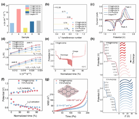 圖3. (a,b) SS|TTP@PVDF (75-25)/TTP-PVDF50/PP|SS的鋰離子電導(dǎo)率及Li+遷移數(shù);(c) S@CNT||Li 電池CV;(d) TTP@PVDF50與TTP-PVDF50電池的CV峰值電流與掃描速率平方根的關(guān)系;(e) TTP@PVDF50電池的GITT曲線;(f) TTP@PVDF50與TTP-PVDF50電池的內(nèi)阻對比;(g) Li+和COF的均方位移隨模擬時間的變化關(guān)系;(h) TTP@PVDF50與TTP-PVDF50電池的原位電化學(xué)阻抗.