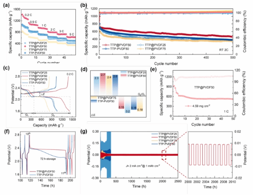 圖5. S@CNT|TTP@PVDF(25-75)|Li的 (a) 倍率性能 (b) 2 C電流密度下的長循環(huán)性能及 (c) 倍率充放電曲線;(d) TTP@PVDF50與TTP-PVDF50電池在0.2 C電流密度下的高放電平臺容量(Q2)與低放電平臺容量(Q1)分析;(e) 高負載S@CNT|TTP@PVDF50|Li電池循環(huán)性能;(f) S@CNT|TTP@PVDF50/ TTP-PVDF50|Li的自放電性能;(g) 組裝的Li||Li對稱電池性能(插圖為選定循環(huán)區(qū)間的局部放大圖)。