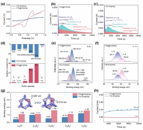 圖4. (a) Li|TTP@PVDF50|Li and Li|TTP-PVDF50|Li電池的CV圖;(b,c) Li2S形核與沉積曲線; (d,e,f) 多硫化物沉積后TTP@PVDF50與TTP-PVDF50的S 2p和Li 1s元素XPS譜圖;(g) TTP@PVDF50和TTP-PVDF50與多硫化物(LiPSs)的結(jié)合能強度對比及靜電勢分布圖(插圖);(h) 穿梭電流測試。