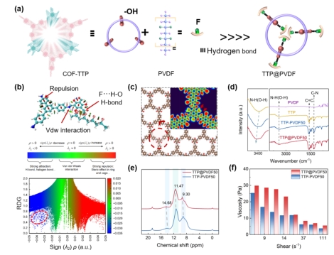 圖2. (a) TTP COF與PVDF氫鍵交聯(lián)示意圖。(b) TTP@PVDF50的RDG和Sign(??2)??函數(shù)關(guān)系圖。(c) 共價有機框架差分電荷密度。(d) TTP@PVDF50、TTP-PVDF50、PVDF和TTP的傅里葉變換紅外光譜(FT-IR)。(e) TTP@PVDF50的固態(tài)核磁共振氫譜(1H NMR). (f) TTP@PVDF50與TTP-PVDF50的粘度隨剪切速率變化曲線.