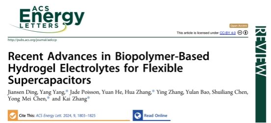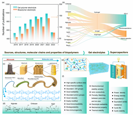 近年來,對(duì)化石燃料資源的日益擔(dān)憂激發(fā)了對(duì)開發(fā)可用于先進(jìn)電化學(xué)儲(chǔ)能設(shè)備的綠色、可再生材料的需求。生物質(zhì)材料具有獨(dú)特的層級(jí)結(jié)構(gòu)和物理化學(xué)性質(zhì),可作為發(fā)展可持續(xù)能源的強(qiáng)有力的平臺(tái),在超級(jí)電容器的凝膠電解質(zhì)中得到了廣泛的應(yīng)用。在這篇綜述中,課題組概述了各種天然高分子的結(jié)構(gòu)和特性,討論了超級(jí)電容器的的儲(chǔ)能機(jī)制,并評(píng)估了用于超級(jí)電容器的凝膠電解質(zhì)的評(píng)價(jià)指標(biāo),著重分析了天然高分子材料在凝膠電解質(zhì)中發(fā)揮的作用。此外,還概述了用于超級(jí)電容器的天然高分子基水凝膠電解質(zhì)的最新電化學(xué)性能及其它多種功能,同時(shí)強(qiáng)調(diào)了當(dāng)前的技術(shù)挑戰(zhàn)和潛在的解決方案。本文旨在全面綜述天然高分子基水凝膠電解質(zhì)的最新進(jìn)展,重點(diǎn)介紹了有關(guān)綠色和可持續(xù)超級(jí)電容器的研究以及進(jìn)一步發(fā)展的潛在路徑。相關(guān)成果以“Recent Advances in Biopolymer-Based Hydrogel Electrolytes for Flexible Supercapacitors”為題發(fā)表在《ACS Energy Letters》期刊上。