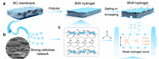 機(jī)械性能和離子傳輸性能是凝膠電解質(zhì)的核心性能指標(biāo),對(duì)其應(yīng)用性能和穩(wěn)定性具有重要影響。尤其在水凝膠中,高含水量雖然能夠提供更好的離子傳輸通道,但卻往往導(dǎo)致機(jī)械強(qiáng)度顯著下降。與此同時(shí),為了提高機(jī)械性能,通常需要增加水凝膠的交聯(lián)度,但過高的交聯(lián)程度會(huì)導(dǎo)致離子通道的縮小,從而影響其離子傳輸能力。這種“性能需求互斥”的現(xiàn)象使得在水凝膠電解質(zhì)的設(shè)計(jì)中,如何在保持較高機(jī)械強(qiáng)度的同時(shí)確保良好的離子傳導(dǎo)性成為一項(xiàng)極具挑戰(zhàn)的任務(wù)。為此,課題組研究了一種利用具有弱離子相互作用的層狀細(xì)菌纖維素網(wǎng)絡(luò)制備高強(qiáng)度、高離子導(dǎo)電的水凝膠(IBVA)的簡(jiǎn)單方法。具體來說,具有高結(jié)晶度和機(jī)械強(qiáng)度的細(xì)菌纖維素(BC)膜被用作水凝膠基質(zhì)的堅(jiān)固骨架。同時(shí),引入具有“鹽溶”作用的陰離子(HCOO-),調(diào)整聚合物的聚集狀態(tài),使聚合物-離子-溶劑形成弱氫鍵相互作用,最終形成“硬-軟-硬”互鎖的層次結(jié)構(gòu)。該策略使水凝膠能夠?qū)崿F(xiàn)105 ± 5 mS cm-1的超高離子電導(dǎo)率,同時(shí)能夠滿足機(jī)械強(qiáng)度需求(0.78 MPa),優(yōu)于大多數(shù)報(bào)道的水凝膠電解質(zhì)。此外,IBVA作為超級(jí)電容器的電解質(zhì),表現(xiàn)出良好的柔韌性、廣泛的溫度適應(yīng)性、界面穩(wěn)定性和穩(wěn)定的電化學(xué)性能。相關(guān)研究成果以“Design of Hydrogel Electrolytes Using Strong Bacterial Cellulose with Weak Ionic Interactions”為題發(fā)表在《ACS Nano》期刊上。