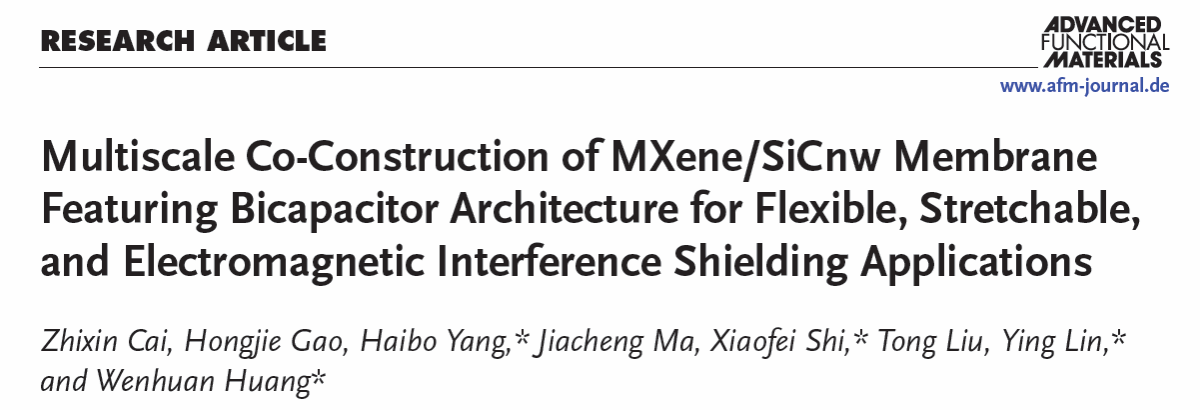 近日,材料科學(xué)與工程學(xué)院楊海波教授團(tuán)隊(duì),在國(guó)際頂級(jí)期刊《Advanced Functional Materials》(IF:19)上發(fā)表了題為“Multiscale Co-Construction of MXene/SiCnw Membrane Featuring Bicapacitor Architecture for Flexible, Stretchable, and Electromagnetic Interference Shielding Applications”的研究論文。陜西科技大學(xué)楊海波教授、林營(yíng)教授、黃文歡教授和中國(guó)建筑材料科學(xué)研究總院有限公司石曉飛高級(jí)工程師為文章共同通訊作者,陜西科技大學(xué)材料學(xué)院博士后蔡志新為文章第一作者,陜西科技大學(xué)為第一通訊單位。