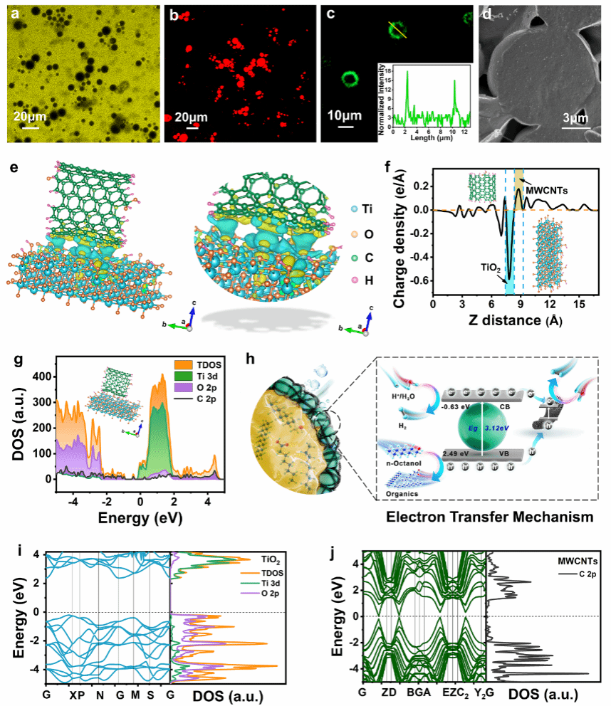 近日,陜西科技大學(xué)屈彥寧博士與墨爾本大學(xué)Gang Kevin Li(李剛)教授合作在國際知名期刊《Advanced Functional Materials》(一區(qū)TOP, IF=19)上發(fā)表了題為“Emulsion droplet microreactors for efficient heterogeneous photoreforming hydrogen evolution”的研究論文。陜西科技大學(xué)為第一作者及第一通訊作者單位。該研究開發(fā)出由TiO2/MWCNTs復(fù)合材料穩(wěn)定的Pickering乳液微反應(yīng)體系,用于液-液非均相界面光催化重整制氫。采用該材料穩(wěn)定的Pickering乳液,其最優(yōu)產(chǎn)氫量較單一水相TiO2提升了9.93倍, 表觀量子產(chǎn)率AQY是油水混合體系的5.2倍。本研究為強(qiáng)化液-液非均相光重整反應(yīng)及生物質(zhì)衍生物再利用提供了有利支持。