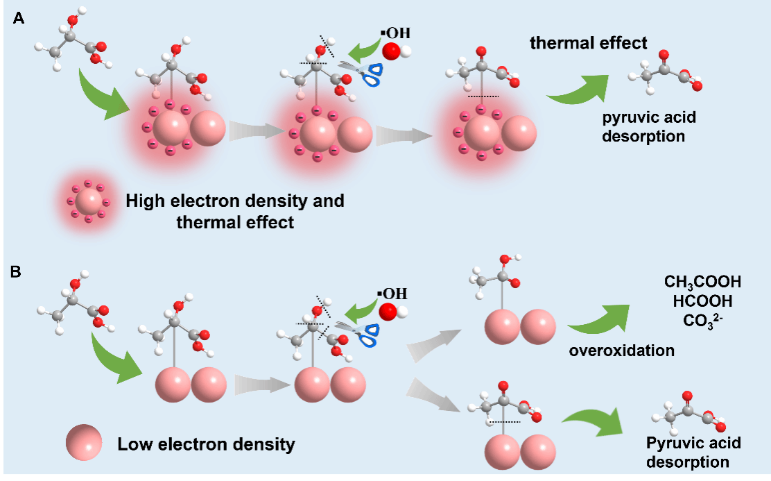 利用光催化方式將聚乳酸(PLA)塑料轉(zhuǎn)化為丙酮酸學(xué)品,對開發(fā)環(huán)境友好且經(jīng)濟(jì)可行的回收技術(shù)、推動碳循環(huán)經(jīng)濟(jì)發(fā)展具有重要意義。然而,乳酸催化脫氫生成丙酮酸的過程中,乳酸分子在催化劑表面的吸附太強會導(dǎo)致產(chǎn)物無法脫附,引發(fā)丙酮酸C?C鍵的斷裂從而被過度氧化的問題。同時由于羥基氧化為羰基的活化能較高,導(dǎo)致該反應(yīng)效率及選擇性較低。因此,當(dāng)前的關(guān)鍵挑戰(zhàn)在于如何有效增強乳酸中的C?C鍵強度激活α?OH的同時,促進(jìn)丙酮酸產(chǎn)物在催化劑表面的脫附過程。