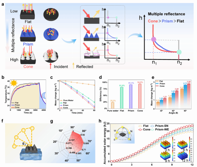 圖5:三維錐形陣列設(shè)計及太陽能蒸發(fā)性能測試
