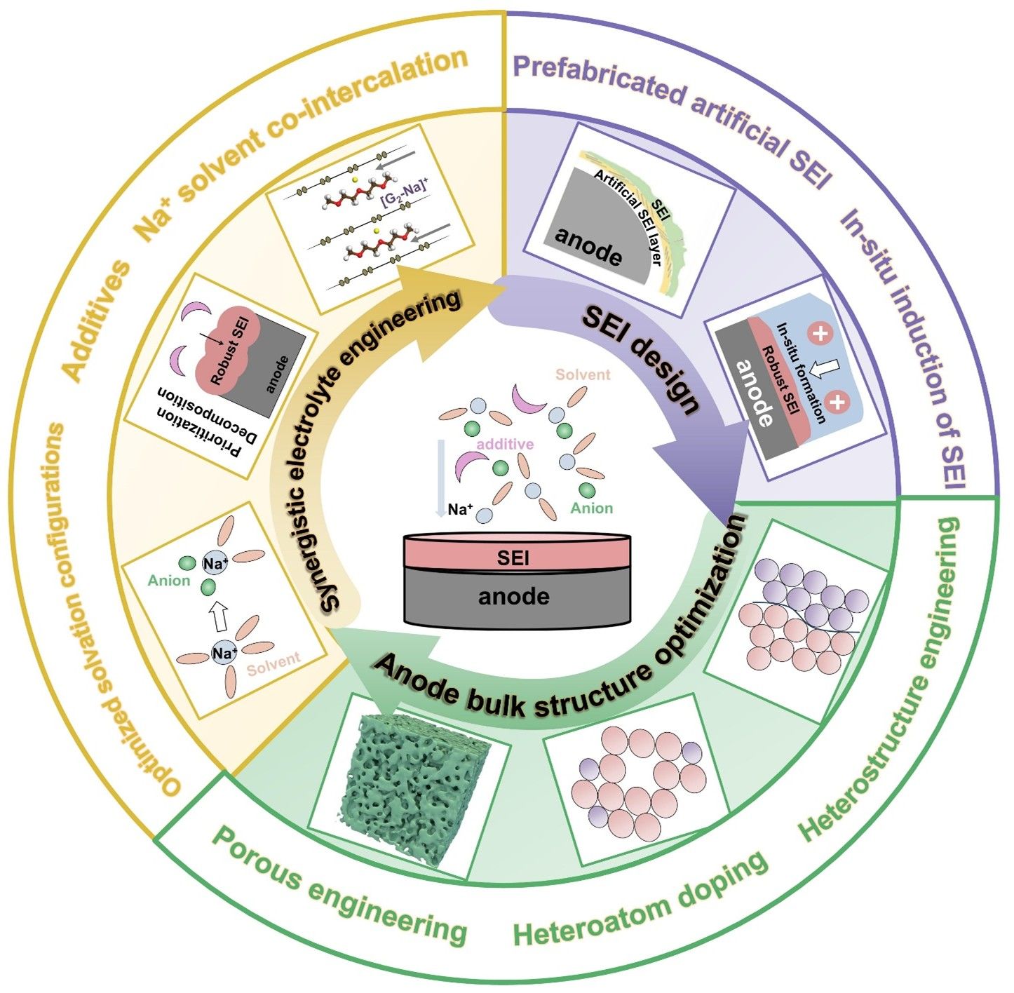 本論文從Na+遷移的動力學過程出發(fā),分析了鈉離子電池負極面臨的核心挑戰(zhàn),主要集中在以下四個方面:(1)Na+脫溶劑化過程的緩慢;(2)SEI層內(nèi)部離子傳輸?shù)氖芟?;?)負極內(nèi)部固態(tài)擴散的緩慢;(4)鈉化/脫鈉過程中的顯著體積變化?;诖?,本論文構建了一套以機制為導向、策略相匹配的綜述框架。圍繞體相結構優(yōu)化、協(xié)同電解液工程以及合理SEI設計三個方面,系統(tǒng)總結了近年來的代表性研究進展,力求為高性能鈉離子電池快充負極的設計提供更具針對性的理論支撐與實踐參考。最后,對未來鈉離子電池快充負極材料的發(fā)展方向、面臨的主要挑戰(zhàn)進行了展望,并提出了相應的解決策略。