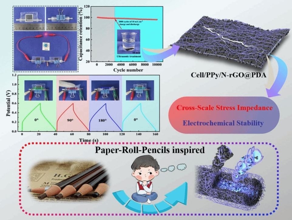 本團(tuán)隊(duì)受到紙卷鉛筆的啟發(fā)提出了一種創(chuàng)新的柔性超級電容器電極設(shè)計,通過自組裝方式構(gòu)建了多層交織的電極結(jié)構(gòu):細(xì)菌纖維素(BC)形成柔性骨架,聚多巴胺(PDA)增強(qiáng)氮摻雜石墨烯(N-rGO)的界面結(jié)合,聚吡咯(PPy)則構(gòu)建連續(xù)的導(dǎo)電網(wǎng)絡(luò)。這種結(jié)構(gòu)不僅具備優(yōu)異的機(jī)械緩沖能力,還能在動態(tài)應(yīng)力下保持穩(wěn)定的電荷傳輸通道。在經(jīng)歷1萬次充放電循環(huán)及高強(qiáng)度超聲波(40 kHz/200 W)擾動后,電容保持率高達(dá)96.3%,展現(xiàn)出卓越的機(jī)械-電化學(xué)耦合性能。相關(guān)研究成果以 “Paper-roll-pencils inspired self-assembled multilayer interwoven nanocellulose supercapacitor electrode enables cross-scale stress impedance coupled with electrochemical stability” 為題發(fā)表在國際期刊Carbohydrate polymers (文章鏈接:https://doi.org/10.1016/j.carbpol.2025.124165)