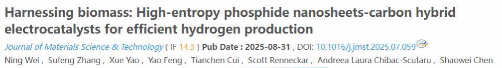 本團(tuán)隊(duì)通過溶劑熱和磷化物拓?fù)浞ㄔ诘颓实亩嗉壙紫短蓟静?CW)上生長出高熵磷化物納米片(NiFeCoWMoP),所制備的NiFeCoWMoP/CW用作集成碳電極,對析氫反應(yīng)(HER)和葡萄糖電催化轉(zhuǎn)化(GCR)均表現(xiàn)出顯著的雙功能特性。在堿性介質(zhì)中可以實(shí)現(xiàn)100 mA cm-2的高電流密度,并且在電解系統(tǒng)中可以在僅1.534 V的低電壓下實(shí)現(xiàn)100 mA cm-2的反應(yīng)電流,并產(chǎn)生氫氣。這項(xiàng)研究的結(jié)果強(qiáng)調(diào)了高熵磷化物納米片作為生物質(zhì)電催化轉(zhuǎn)化和制氫的多功能電催化劑的意義。相關(guān)研究成果以 “Harnessing biomass: High-entropy phosphide nanosheets-carbon hybrid electrocatalysts for efficient hydrogen production” 為題發(fā)表在國際期刊Journal of Materials Science & Technology (文章鏈接:https://doi.org/10.1016/j.jmst.2025.07.059)