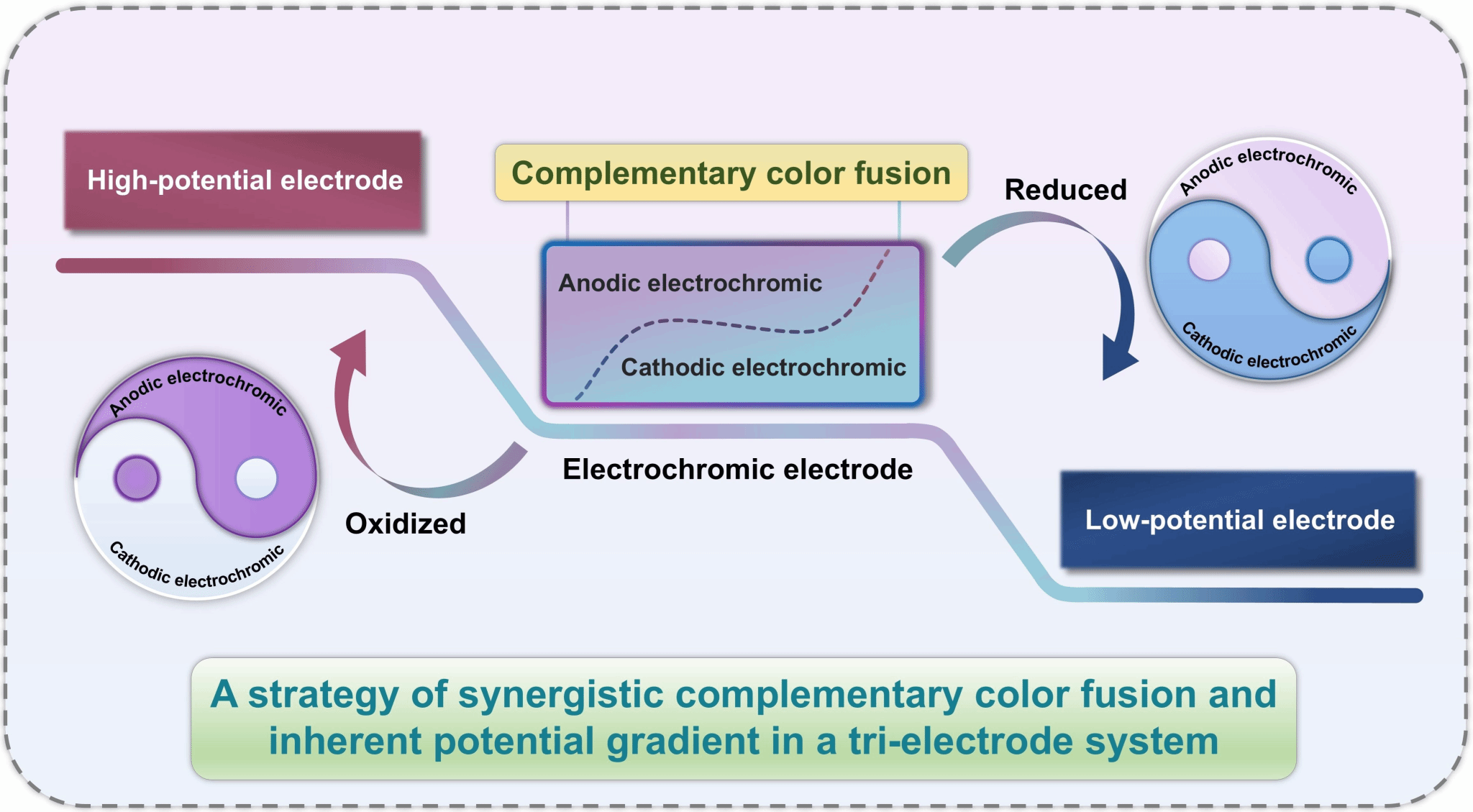 隨著柔性電子與可持續(xù)能源技術(shù)的飛速發(fā)展,開發(fā)兼具信息顯示與能量管理功能的新型器件成為前沿?zé)狳c。本工作創(chuàng)新性地提出了一種新型的自供電電致變色系統(tǒng)。該系統(tǒng)利用陰陽極電致變色材料的互補顏色融合效應(yīng)實現(xiàn)豐富的顏色變化,并以系統(tǒng)內(nèi)部的固有電勢梯度為驅(qū)動力,實現(xiàn)了快速可逆的多色切換,擺脫了傳統(tǒng)器件對外部電源的依賴。此外,該系統(tǒng)還可通過靈活的電極組合,實現(xiàn)多種功率的電能輸出模式并伴隨相應(yīng)的顏色指示?;谏鲜鎏匦裕撓到y(tǒng)已成功應(yīng)用于可重構(gòu)多色顯示陣列與觸控式智能標(biāo)簽,在動態(tài)信息顯示、交互式包裝等領(lǐng)域展現(xiàn)出廣闊的應(yīng)用前景。
