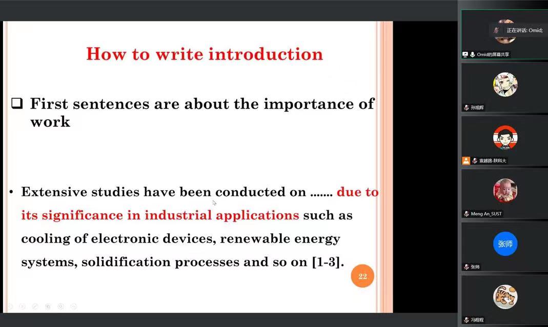 OmidMahian教授“從編輯和審稿人角度分析研究論文撰寫”的報(bào)告贏得了線上師生的掌聲。從查閱文獻(xiàn)、論文不同部分撰寫技巧,系統(tǒng)地講述了科學(xué)論文撰寫和如何合理地選擇期刊進(jìn)行投遞。報(bào)告結(jié)束后,老師和同學(xué)們踴躍提問,大家結(jié)合自己在論文撰寫過程中遇到的難題向OmidMahian教授提出許多學(xué)科問題,Omid Mahian教授也熱情地和老師、同學(xué)進(jìn)行了討論,大家受益匪淺。