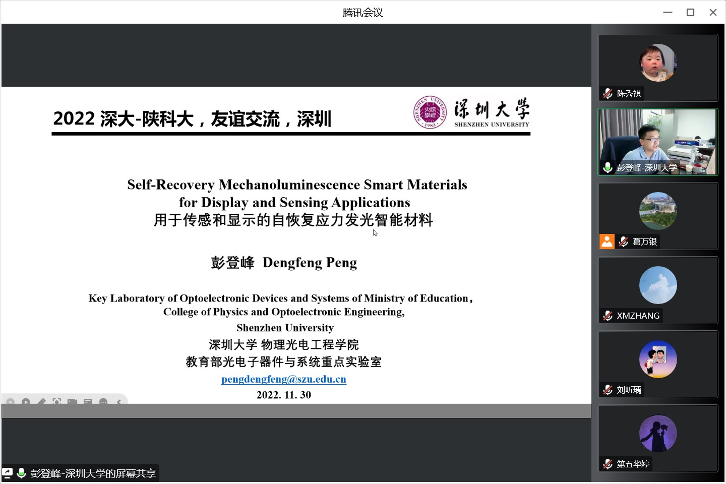 11月30日,應(yīng)我校材料科學(xué)與工程學(xué)院、科技處及前沿院邀請(qǐng),深圳大學(xué)彭登峰教授做客我?!扒把乜茖W(xué)報(bào)告”,為我校師生帶來(lái)主題為“用于傳感和顯示的自恢復(fù)應(yīng)力發(fā)光智能材料”的學(xué)術(shù)報(bào)告。報(bào)告會(huì)由材料學(xué)院副院長(zhǎng)王卓教授主持,材料學(xué)院相關(guān)專業(yè)教師及研究生參加了此次報(bào)告會(huì)。